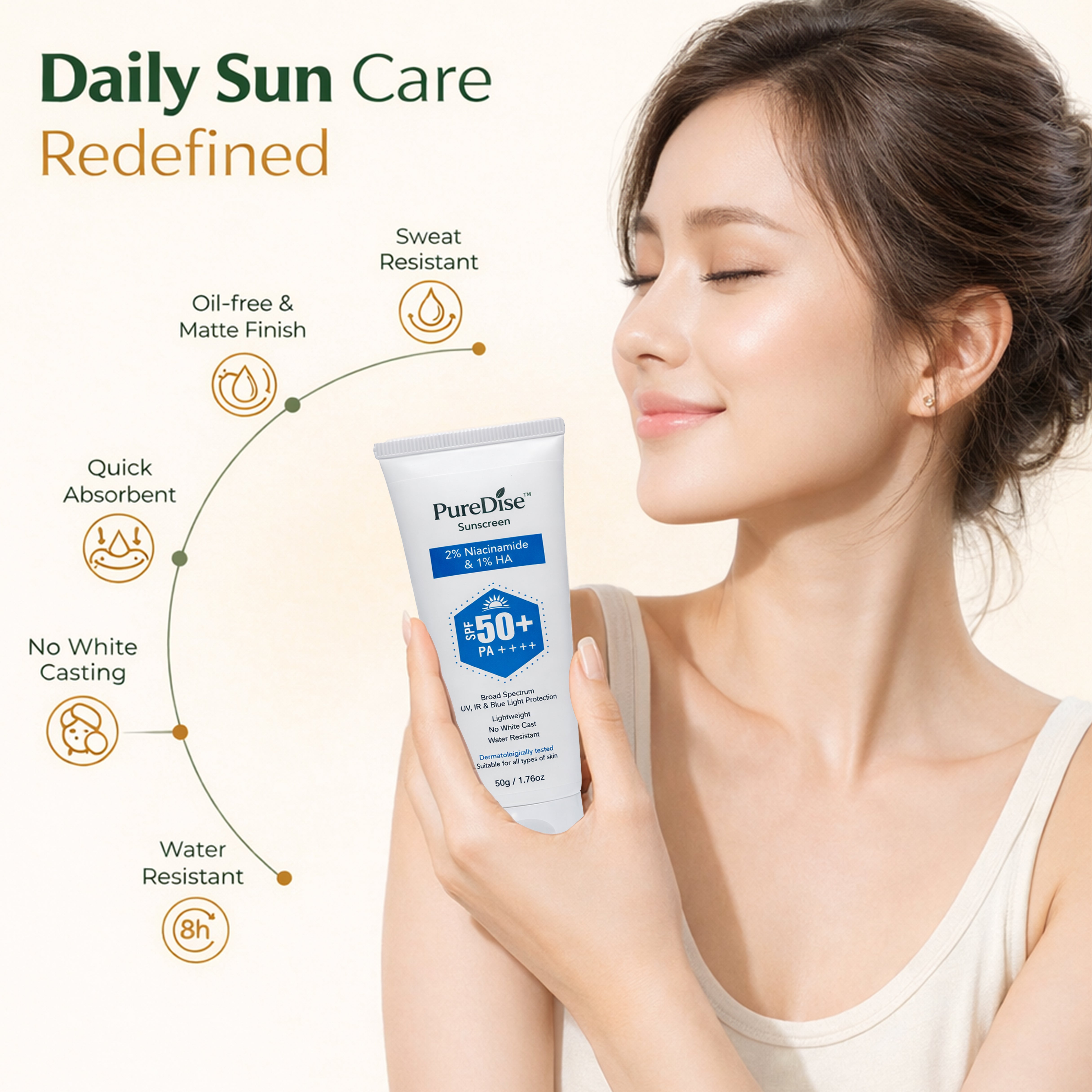 Our SPF 50 PA++++ Sunscreen provides broad-spectrum protection against UVA & UVB rays, helping protect skin from sun damage, tanning, and premature aging. The lightweight, non-greasy formula blends effortlessly into the skin without leaving a white cast.