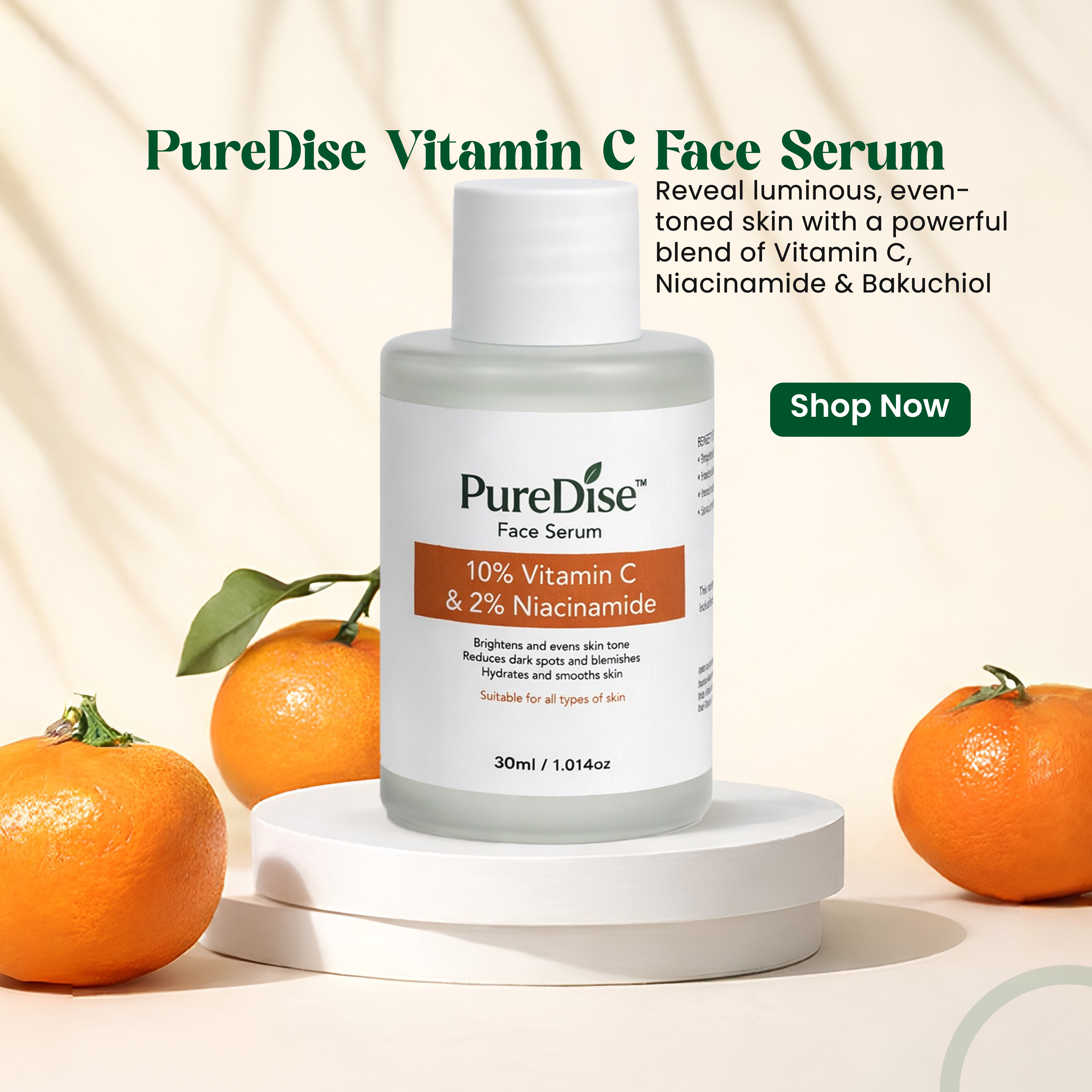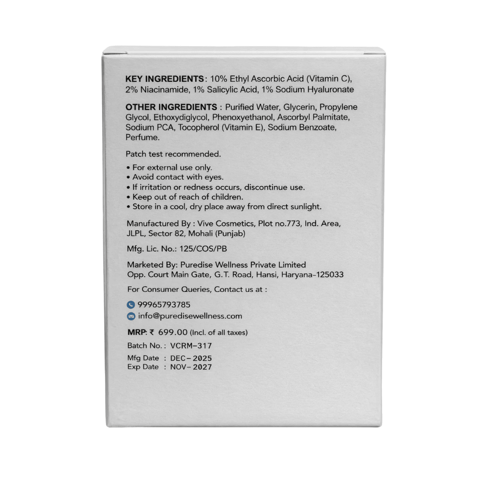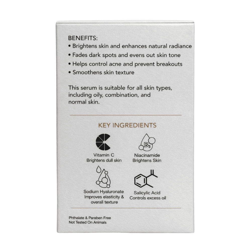 Our 10% Vitamin C Face Serum is a lightweight, fast-absorbing formula designed to brighten dull skin, improve uneven tone, and support a healthy skin barrier. Enriched with Niacinamide, Salicylic Acid, and Hyaluronic Acid, this multi-active serum helps enhance glow while keeping skin balanced and hydrated.
